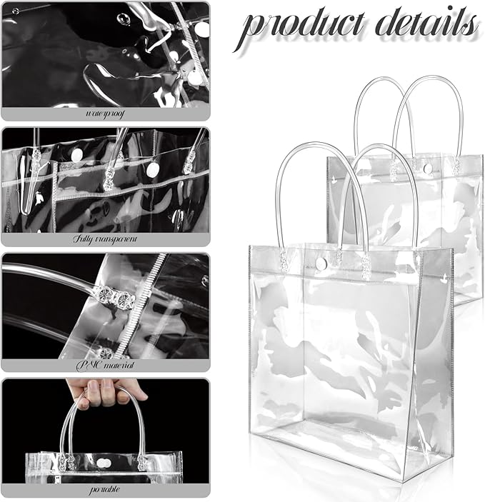 - Quality Material: The clear gift bags with handles are made of high quality clear PVC plastic material,waterproof,reusable,not easy to break,durable enough to serve for a long time.Compared with ordinary plastic bags or shopping bags, they have greater carrying capacity
