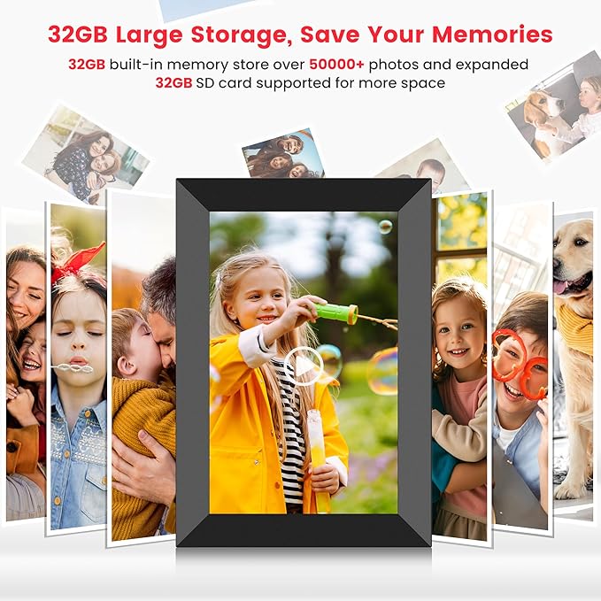 • 32GB MEMORY&MULTIPLE USERS CONNECTION: Frameo wifi digital frame built-in 32GB large storage, support to store over 50000+ pictures in digital photo album. It also support expanded 32GB SD card for uploading or exporting pictures or videos even without a network connection. One Frameo digital frame can be connected with multiple mobile phone. A single picture frame can receive pictures/videos from multiple invited sender, and one sender can also send pictures to multiple digital picture frames that they have bound