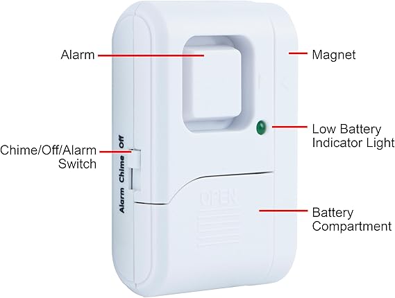 - Safe and Secure – Ward off would-be intruders with a 120-decibel alarm triggered by a high-quality magnetic sensor, or choose for a chime to sound when windows or doors are opened and closed