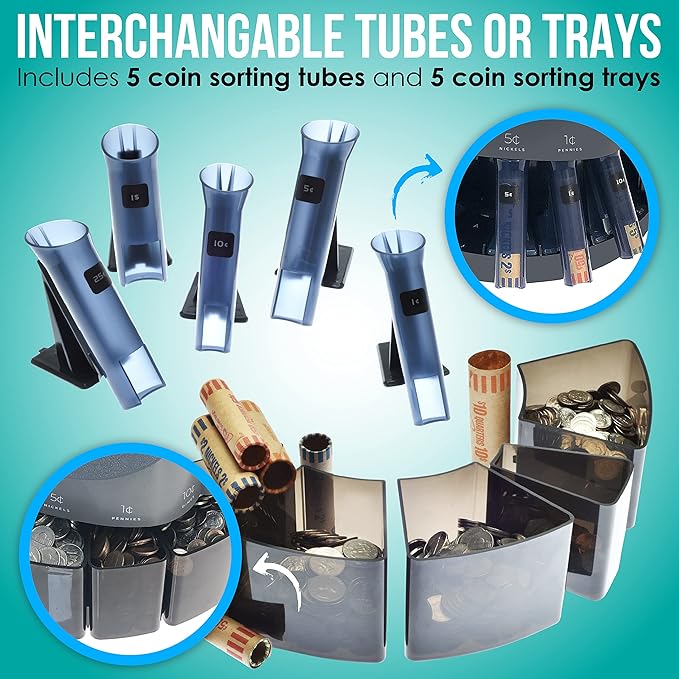 - 🏦 Key Features: Counts and sorts Dollar coins, Quarters, Nickels, Dimes, and Pennies. Displays both count count and total counted value. Sort into coin trays or directly into coin wrappers with the included coin tube attachments. One touch batch setting with Auto-stop to prevent overfilling. Custom batch settings to sort into trays and into tubes simultaneously for different denominations. 48 preformed coin wrappers included.