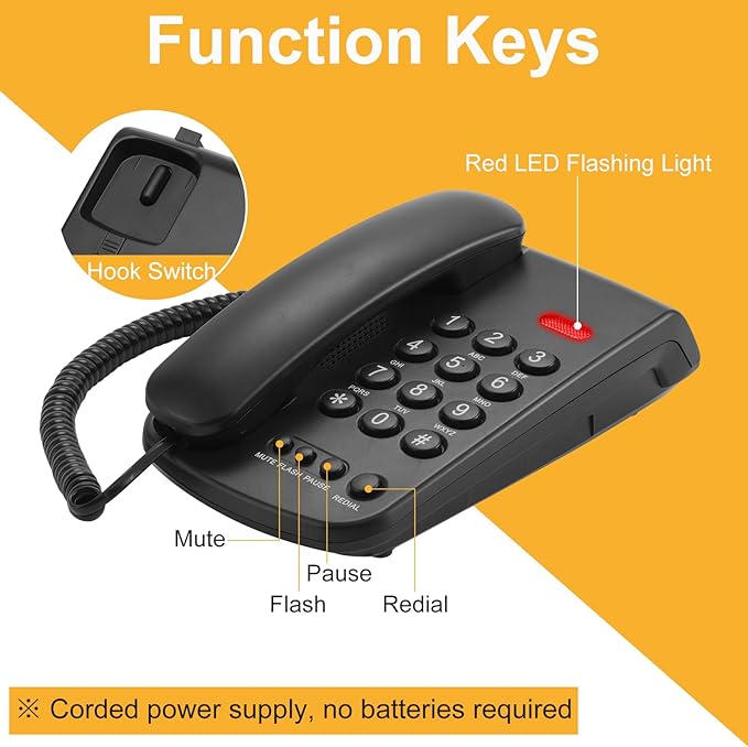 Uvital Corded Phone for Landline, Black Telephone Landline Phones, Landline Corded Phone, Desktop Telephone for Home, Office, Hotel-Mute|Redial|Ringer Volume, Easy-to-Use